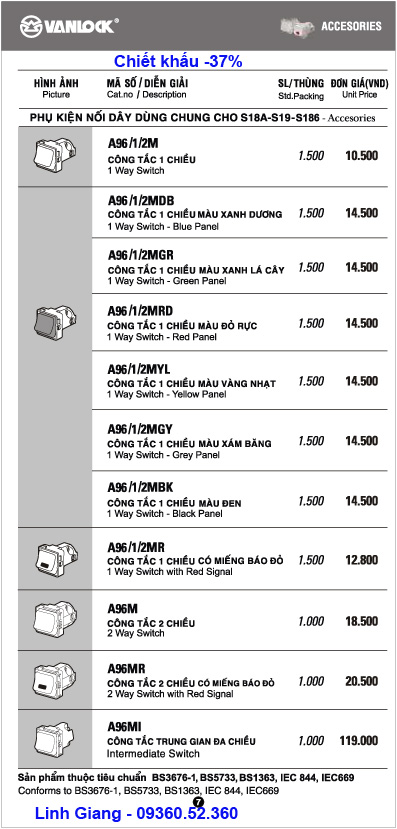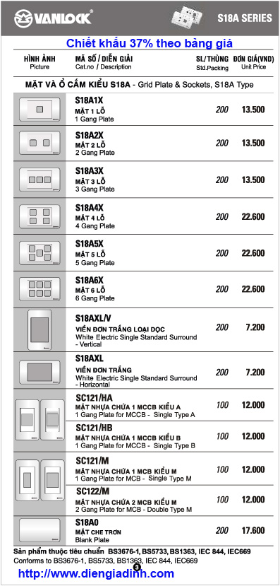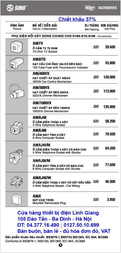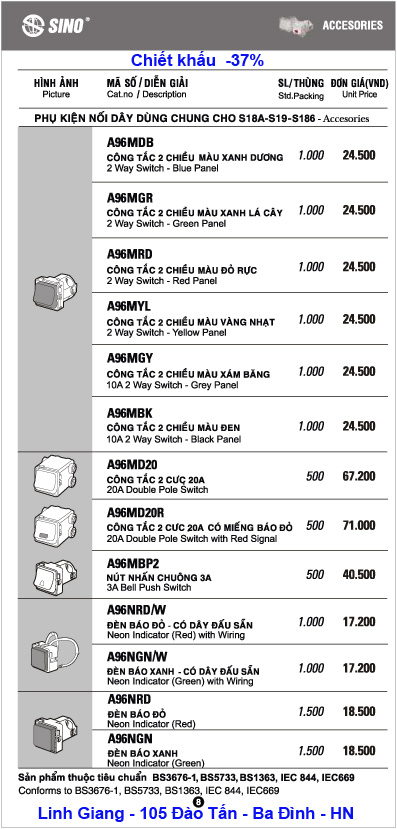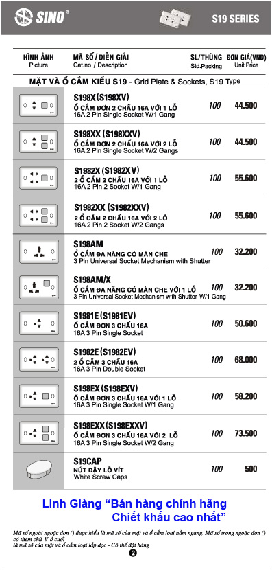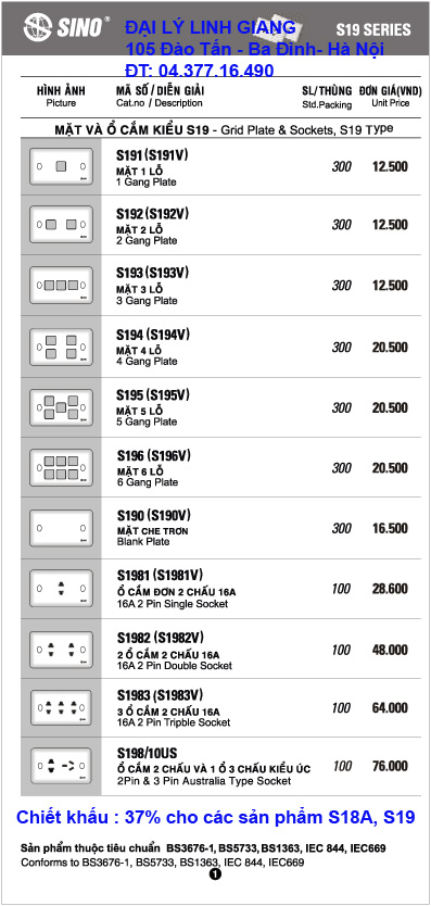 Mức chiết khấu cho dòng sảnphẩm hạt công tắc vuông Sino S18A, S19 là - 37% theo bảng giá niêm yết