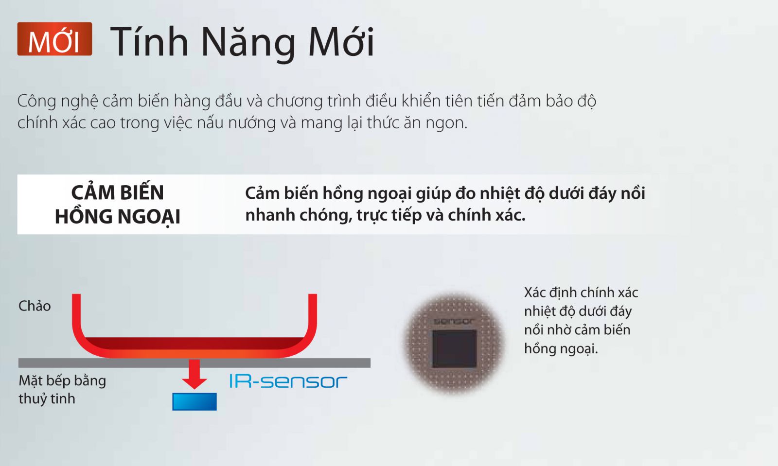 - Cảm biến IR-Sensor đo nhiệt độ của đáy nồi chính xác: cả 2 bếp