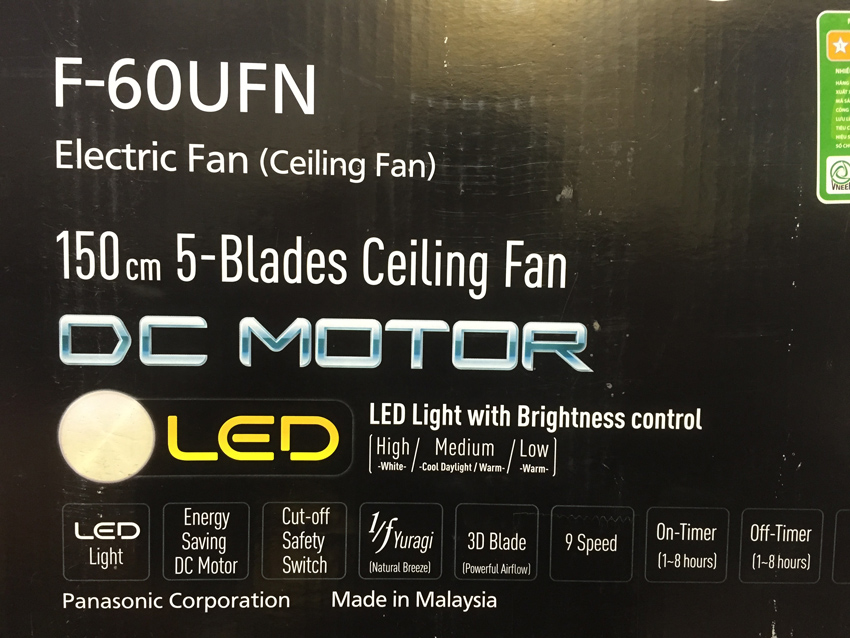 Panasonic Việt Nam vừa ra mắt thị trường model quạt trần cao cấp kết hợp đèn chiếu sáng F60UFN. Đáp ứng được tất cả nhu cầu của người dùng Việt Nam về một chiếc quạt cao cấp: sang trọng, 5 cánh nhựa cao cấp không cong vênh, Tốc độ gió linh hoạt 9 cấp, động cơ DC đời mới, Đèn chiếu sáng LED đổi màu...