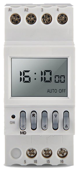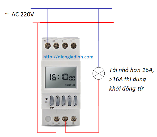 - Chân ra điều khiển 15-16-18, dùng Rơle có tiếp điểm riêng 2 chiều chịu dòng tối đa 16A. khi timer OFF Chân 15 nối chân 16, Khi timer ON sẽ hút chân 15 đóng với 18. Vì vậy các tải lớn hơn 16A cần phải nối qua Khởi động từ